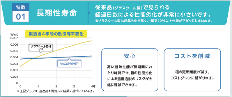 従来の国内で使用されている真空断熱材(グラスウール製)と比較し、優れた性能を持つシリカ系の真空断熱材です。