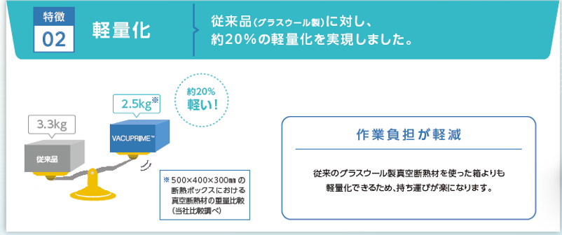 従来の真空断熱材よりも軽量で、持ち運びが楽に