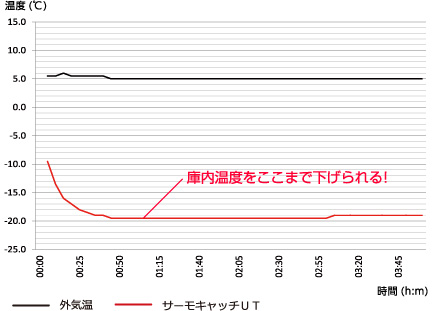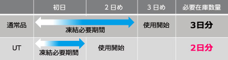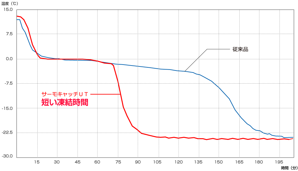 凍結までの時間:サーモキャッチUT…70分、通常品…130分 ※試験条件 外気温(凍結庫設定温度)-25℃