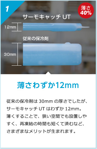 サーモキャッチUTの厚みはわずか12mm、従来の保冷剤の半分以下です。