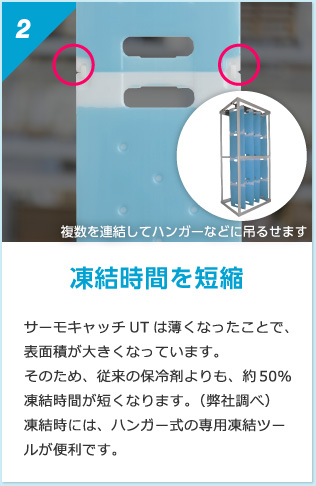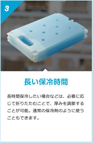 薄いので凍結時間は半分以下(下記凍結実験参照)になり、その分、所有する保冷剤の量を減らすことができます。